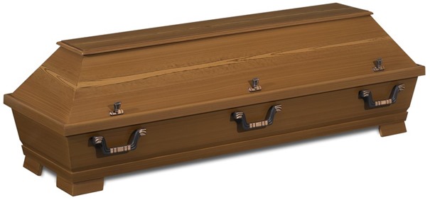 Ein einfacher Sarg aus Kiefernholz in deutscher Form, lackiert mit Zierschrauben und Griffen, geeignet für preisgünstige Beerdigungen.