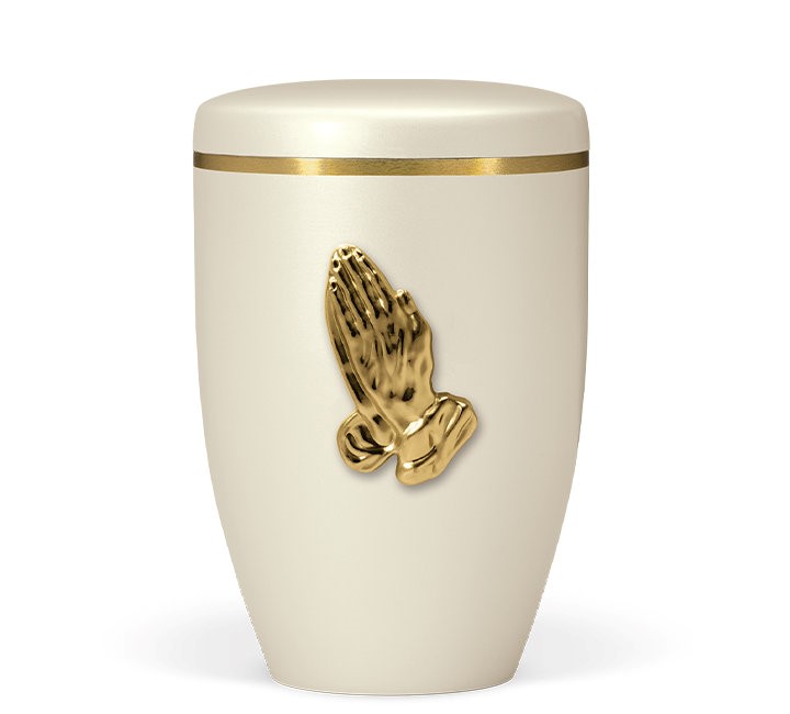 Urne aus Naturmaterial, cremeweißes Perlmutt, polierte betende Hände, Armband aus gebürstetem Gold. Abmessungen: Höhe ca. 27,5 cm Durchmesser ca. 18,0 cm