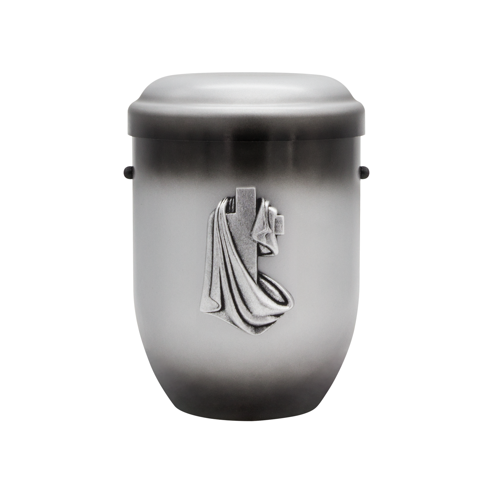 Stahlblechurne ist in Silber mit schwarzen Farbtönen gehalten mit Emblem „Kreuztuch“