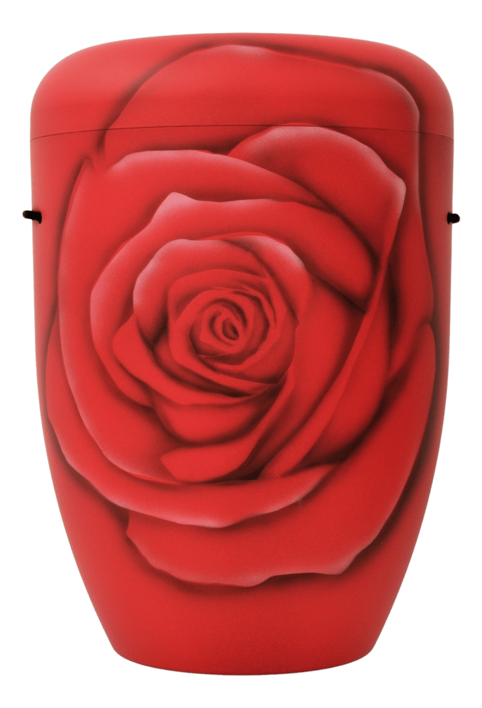 Naturstoff Urne in rot, von Hand gemalte Rosenblüte ganzheitlich. Eine besondere Urne, ganzheitlich bemalt als Rosenblüte in rot. Keine andere Blume symbolisiert so stark die Liebe zu einem Menschen, als eine rote Rose. Weiter Urnen mit Rosenmotiven finden Sie unter unseren Empfehlungen.