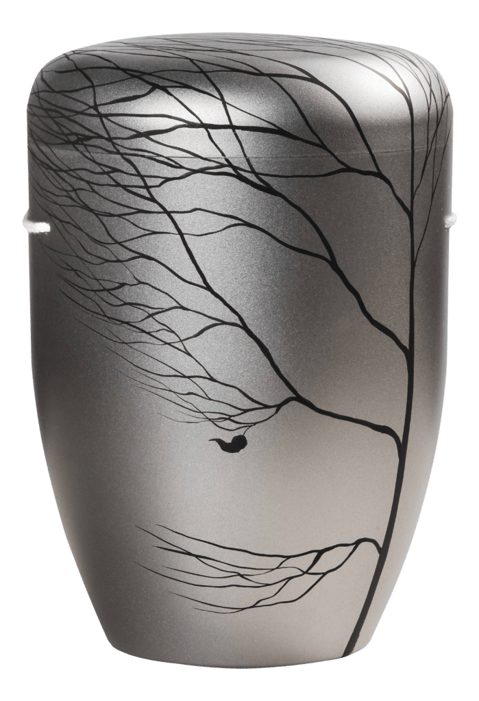 Naturstoff Urne in silbergrau, von Hand gemalter Baum im Wind. Das Laub ist schon vom Winde verweht.