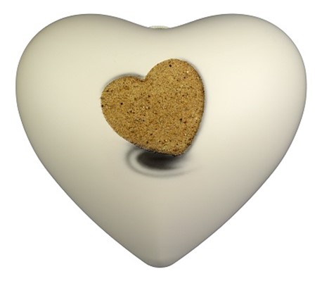 Качественная декоративная урна ручной работы в форме сердца слоновой кости с рельефным сердечком и настоящим песком, биоразлагаемая.