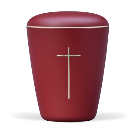 Урна из натурального материала, велюр бордового цвета, золотой крест, золотая лента.